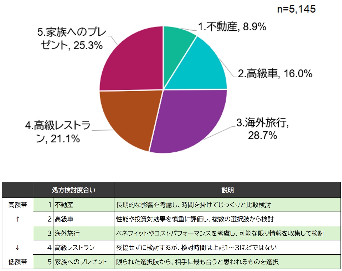 「3.海外旅行(ベネフィットやコストパフォーマンスを考慮し、可能な限り情報を収集して検討)」が28.7% 、「5.家族へのプレゼント(限られた選択肢から、相手に最も合うと思われるものを選択)」が25.3% 、「4.高級レストラン(妥協せずに検討するが、検討時間は上記1〜3ほどではない)」が21.1% でした。