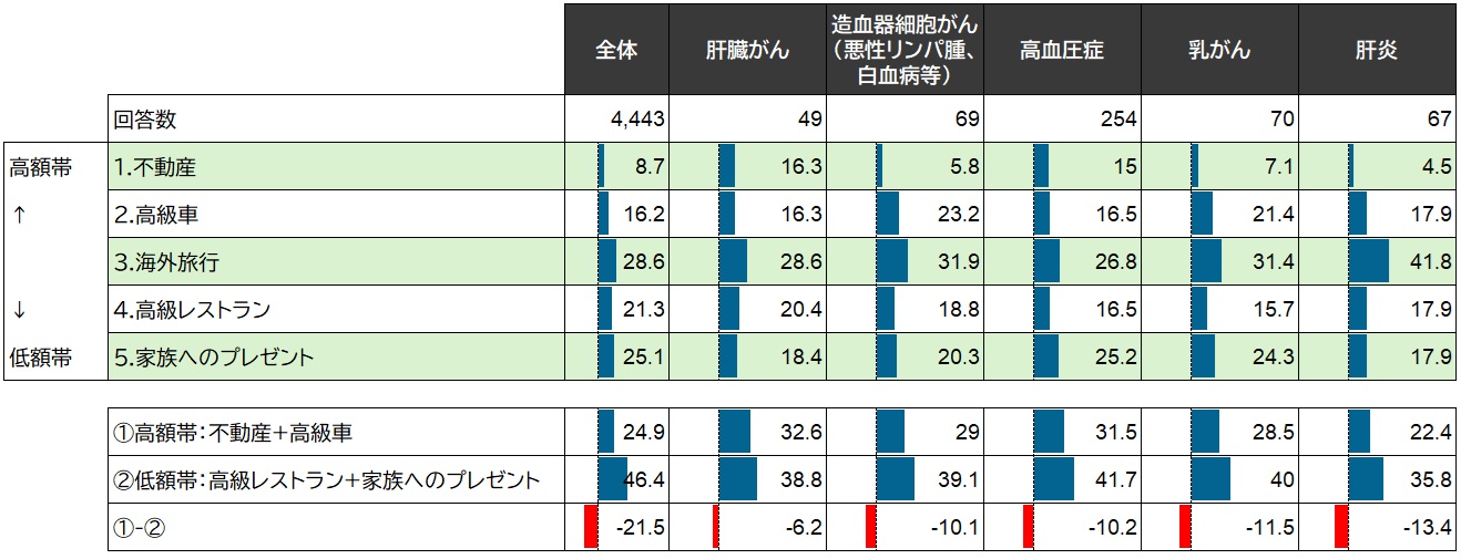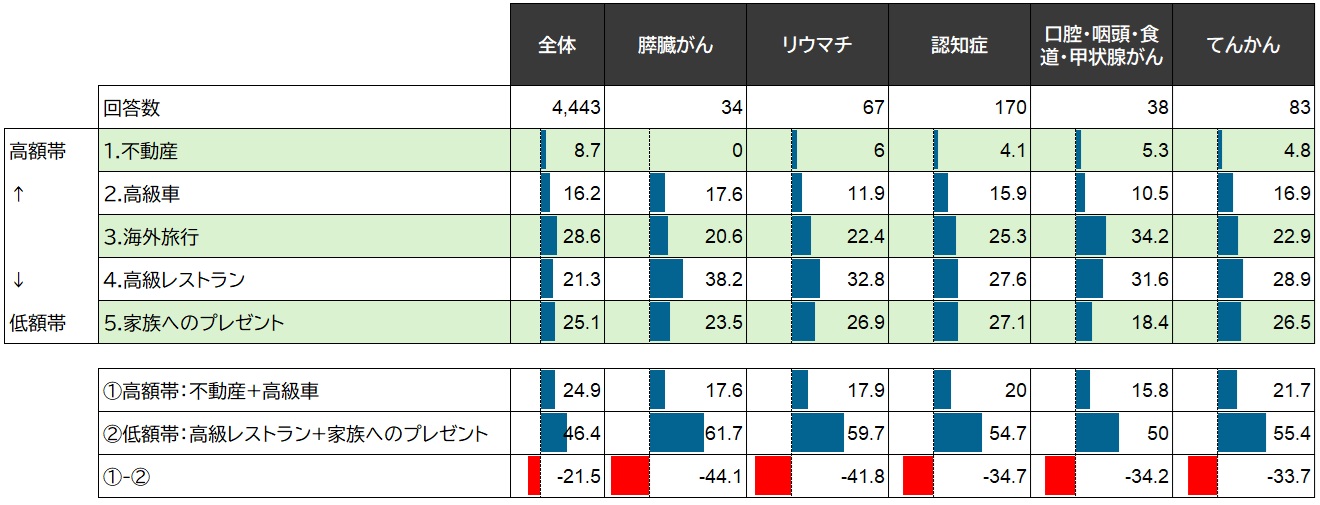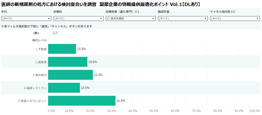 本調査では、専門領域における新薬の処方検討の度合いを、不動産、高級車、海外旅行、高級レストラン、家族へのプレゼントの5段階に分けた場合、どのレベルが近いのかを選択いただき、医師の処方における検討度合いを定量化しました。