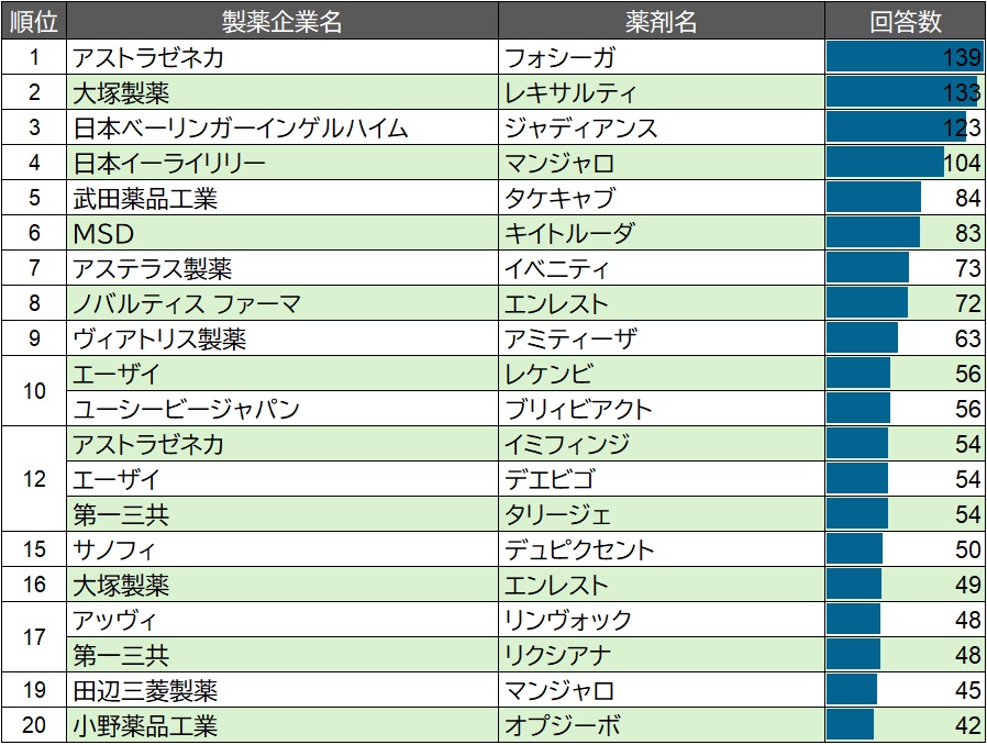 製薬企業別では、1~3位は昨年と同じく1位「アストラゼネカ」、2位「大塚製薬」、3位「第一三共」となり、「日本ベーリンガーインゲルハイム」「ノバルティスファーマ」が新たにランクインしました。