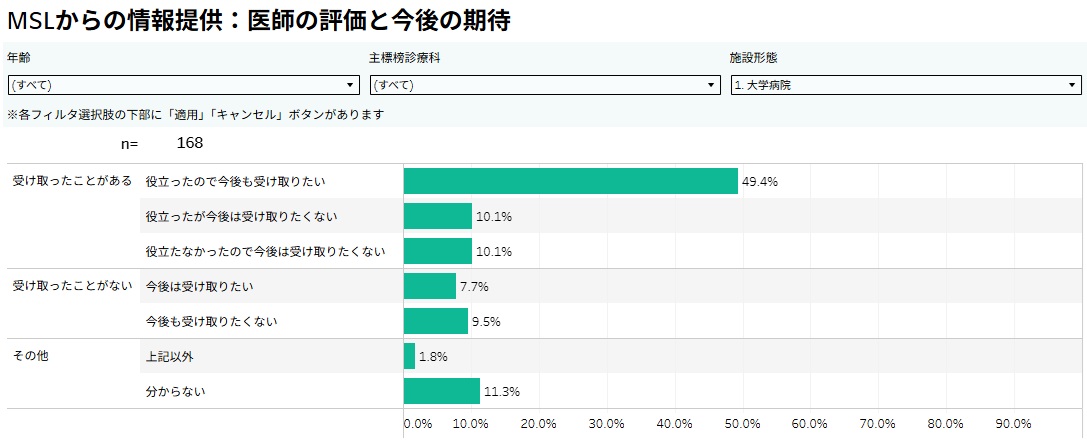 また、「受け取ったことはないが、今後は受け取りたい」と回答した医師が約1割おり、MSLからの情報提供に対する潜在的なニーズも確認できました。