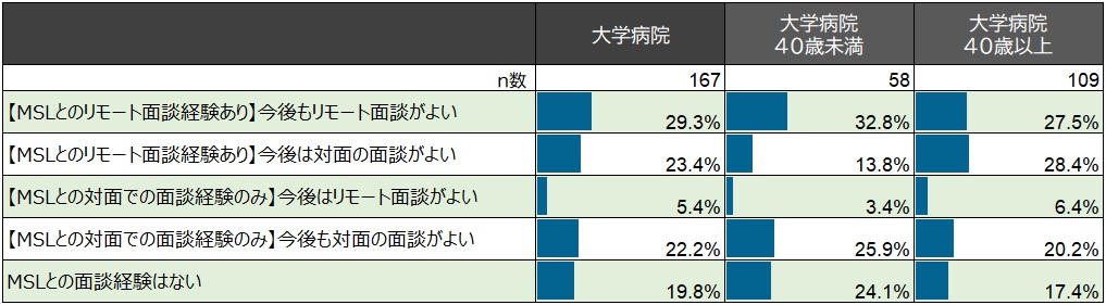 大学病院(40歳未満)ではリモート面談経験者のうち「今後もリモート面談がよい」を選択した医師が32.8%いましたが、国公立病院(40歳未満)では半数近くが「MSLとの面談経験はない」を選んでおり、「今後もリモート面談がよい」を選択した医師は10.8%にとどまりました。