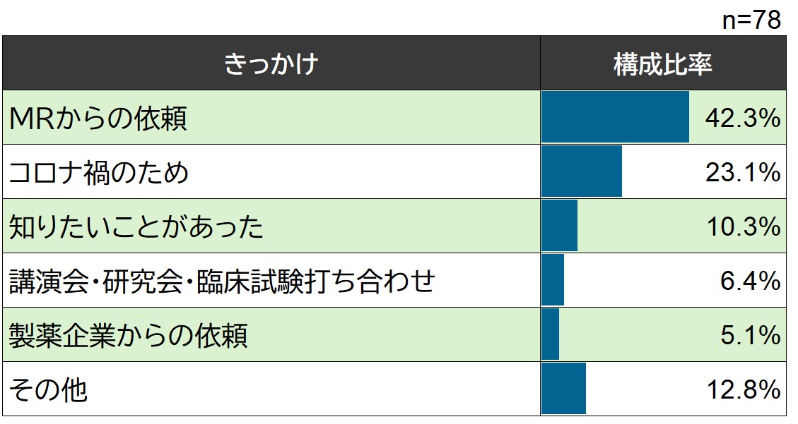 リモート面談を行ったきっかけは、「MRからの依頼」が最も多く、次いで「コロナ禍の影響」や「知りたいことがあった」でした。