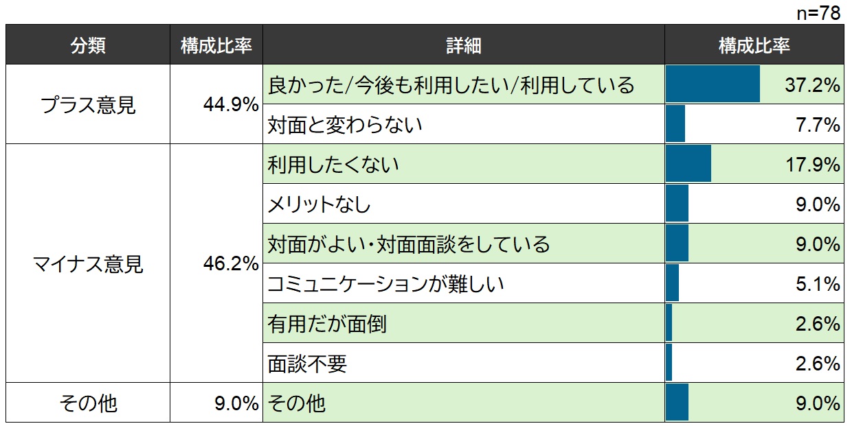 「リモート面談を行った感想」は、プラス意見とマイナス意見に二分されました。プラス意見では「良かった」「今後も利用したい」という声が37.2%を占め、マイナス意見には「利用したくない」「メリットなし」などが挙げられました。