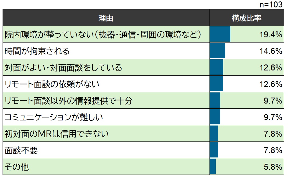 リモート面談経験なしの医師の、「リモート面談をしたことがない理由」を分類して集計しました。