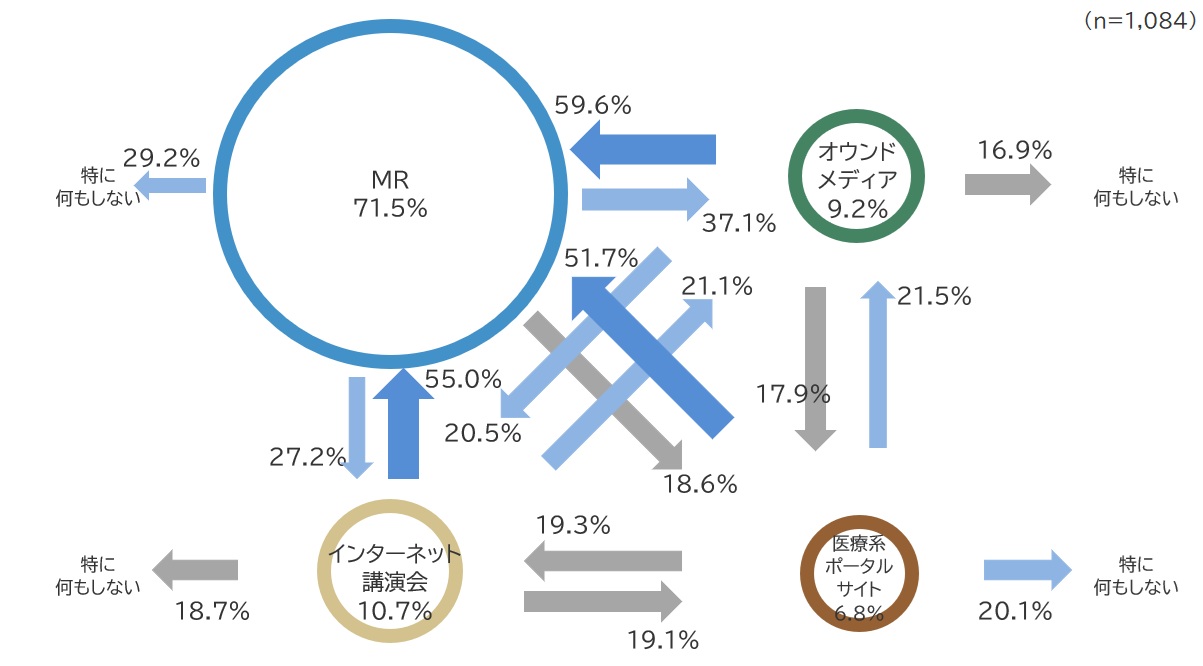 一方、最初に「オウンドメディア」「インターネット講演会」「医療系ポータルサイト」から情報を入手した場合、その後の行動として「MRに確認する」が最も多く、いずれも50%を超えています。