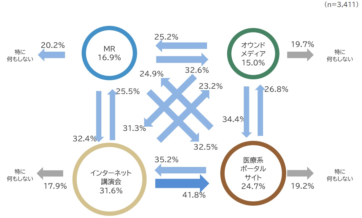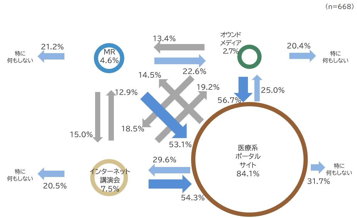 医療系ポータルサイト以外の、「MR」「オウンドメディア」「インターネット講演会」から最初に情報を入手した医師の半数以上が、その後「医療系ポータルサイトで確認する」と答えています。