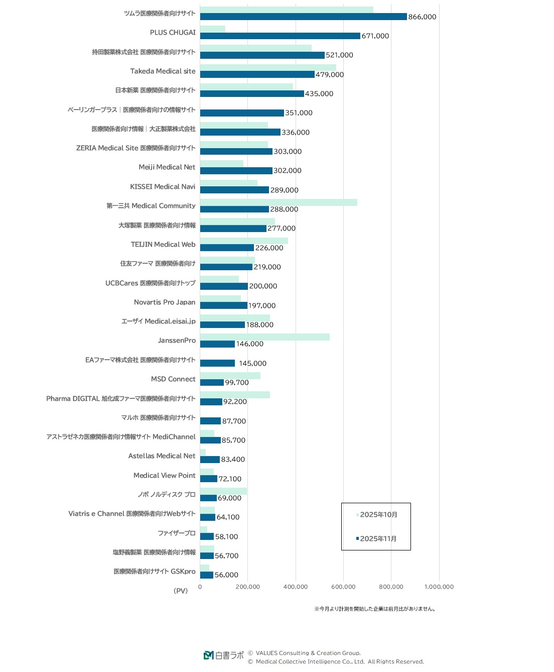 2025年11月の月間PV数※3ランキング上位3位は、ツムラ「ツムラ医療関係者向けサイト」、中外製薬「PLUS CHUGAI」、持田製薬「持田製薬株式会社 医療関係者向けサイト」でした。